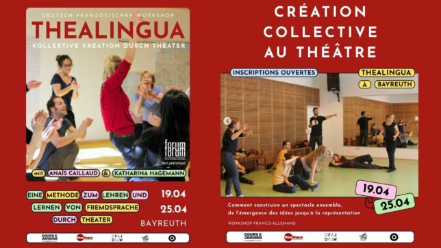 Le Forum franco-allemand des jeunes artistes à Bayreuth et Thealingua sont ravis de vous inviter à participer au workshop Thealingua, une formation franco-allemande centrée sur le travail théâtral collectif, l’apprentissage des langues et la pédagogie.